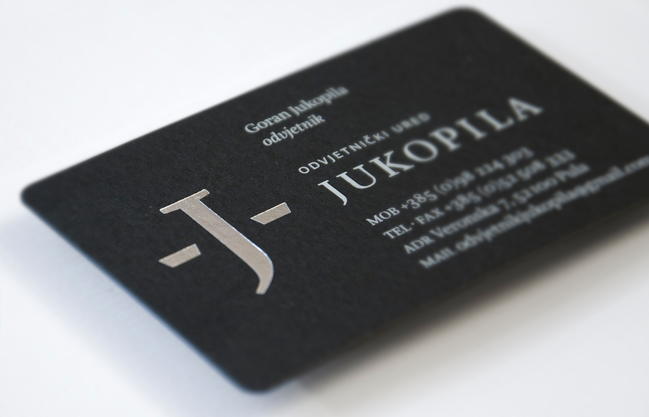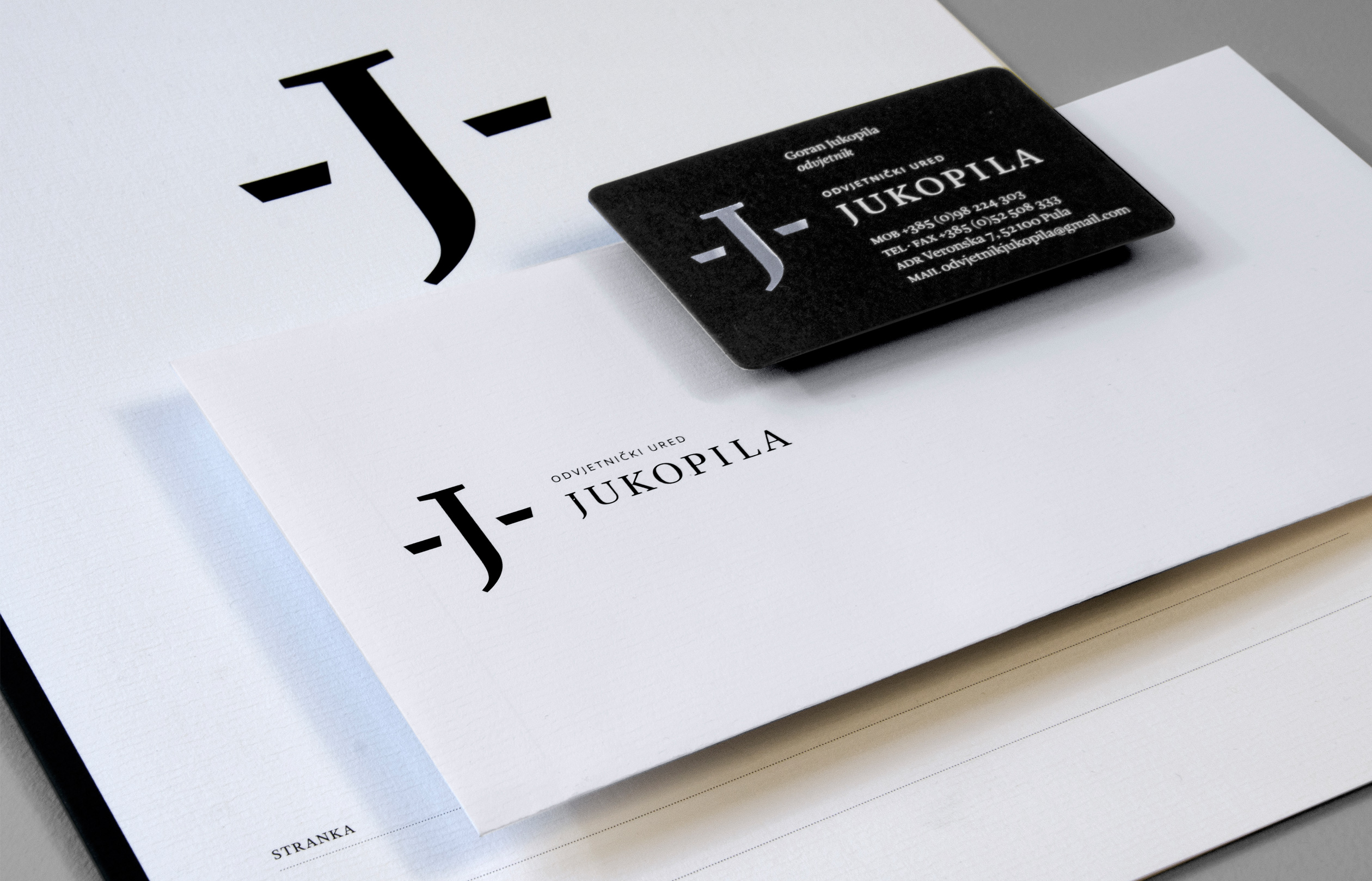 Vizualni identitet za odvjetnički ured Jukopila baziran je na inicijalu koji, uz minimalnu intervenciju, asocira na starinsku vagu - simbol pravde.