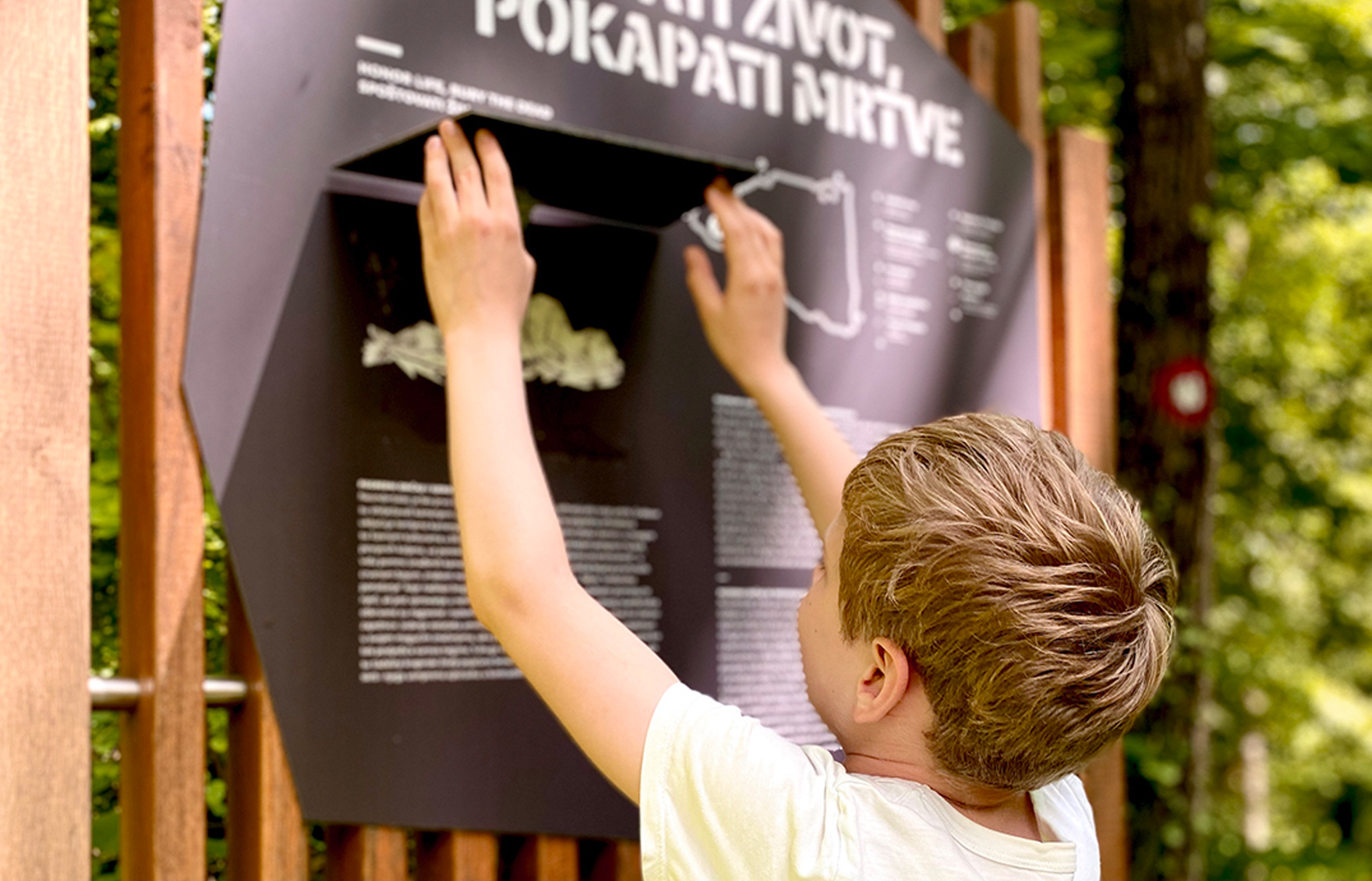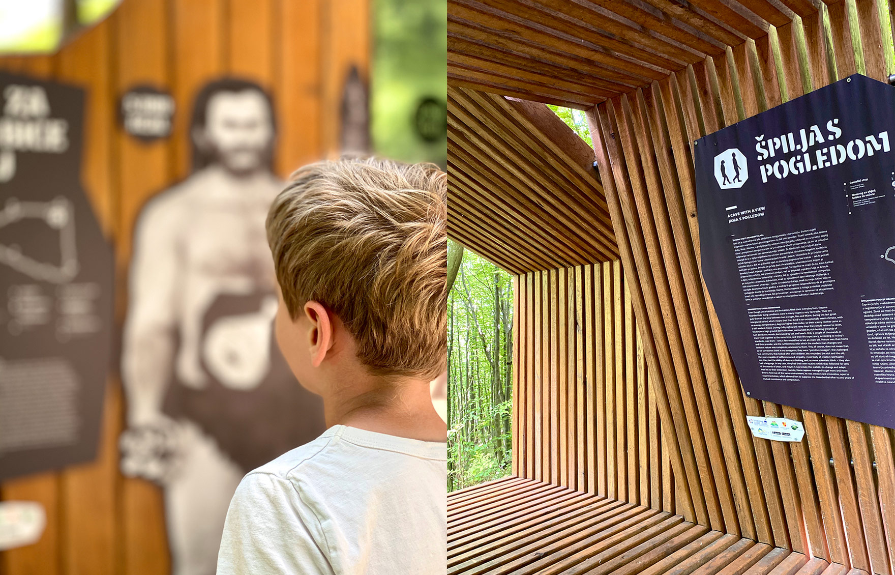 Interpretacijsko interaktivni elementi staze namijenjeni su prvenstveno posjetiteljima školske dobi. Oblikovani su stilizacijom i interpretacijom oblika iz života neandertalaca. Svaki objekt poziva na interakciju s posjetiteljem kako bi ga motivirali na otkrivanje sadržaja i učenje kroz iskustvo.