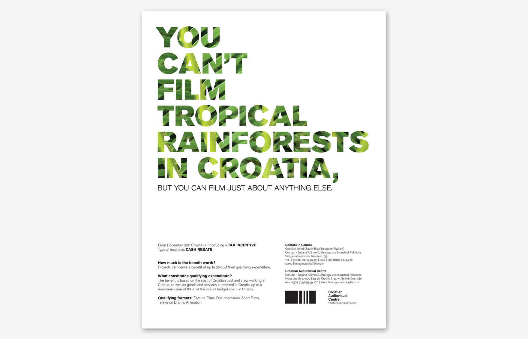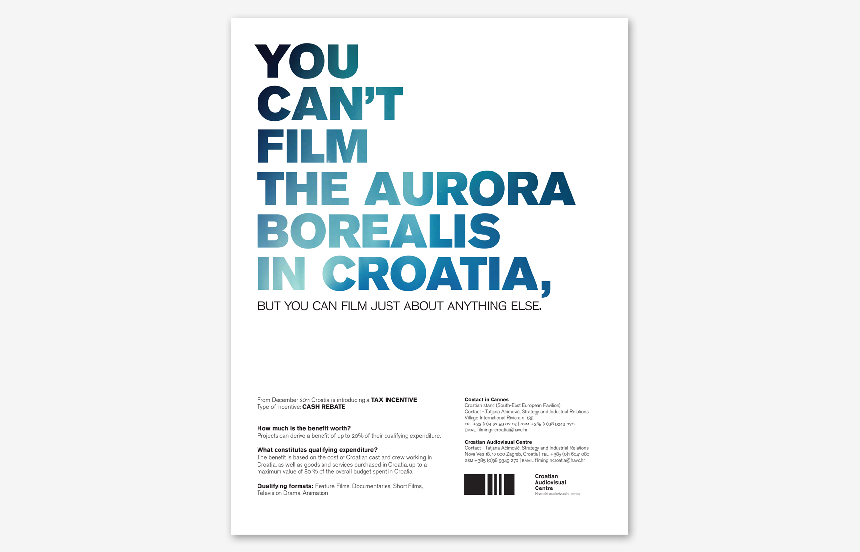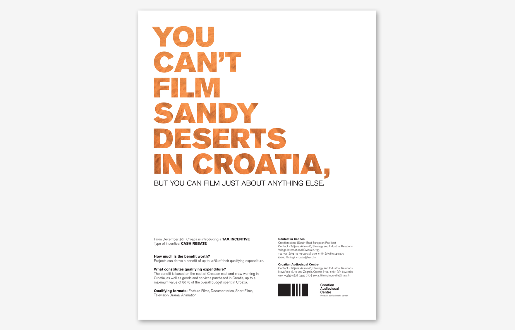 Hrvatski audiovizualni centar uveo je sustav povrata poreza stranim filmskih producentima koji snimaju u Hrvatskoj. Tu novost prezentirali su svjetskoj filmskoj javnosti kroz seriju oglasa objavljenu u stranim specijaliziranim filmskim publikacijama.