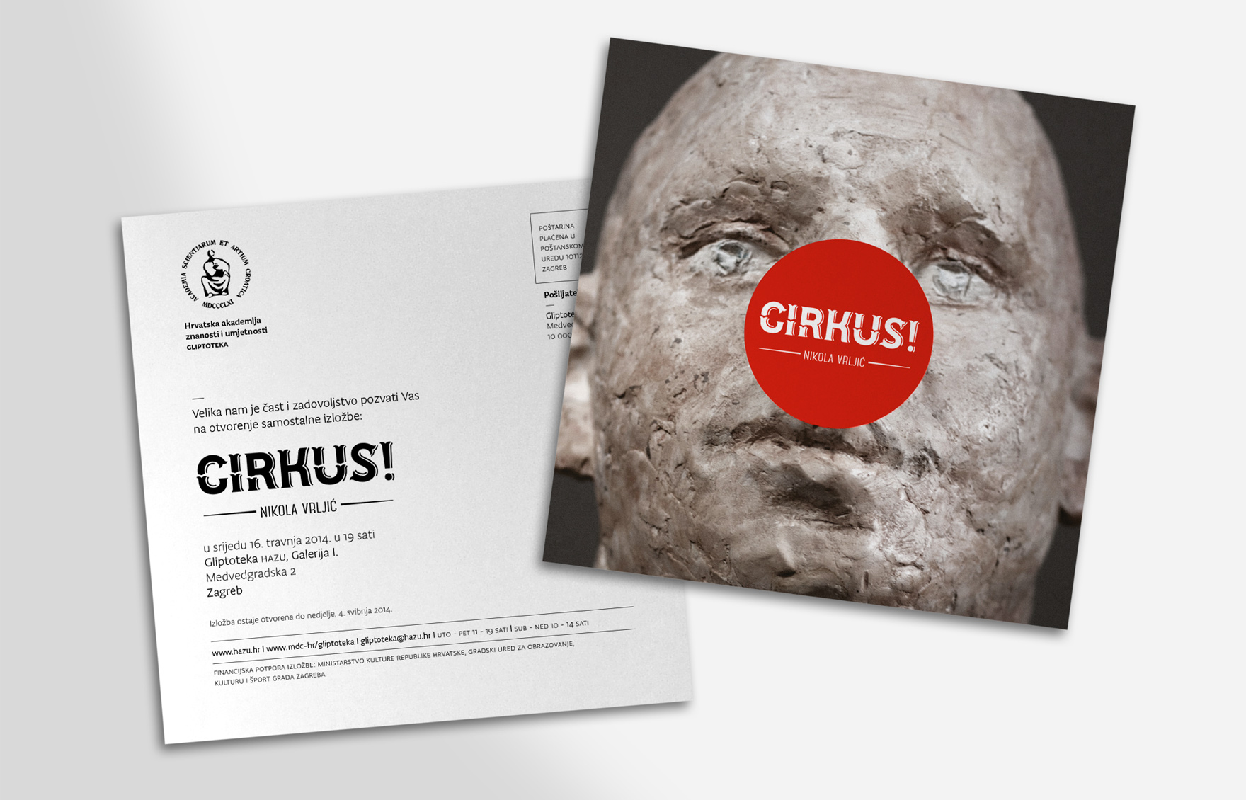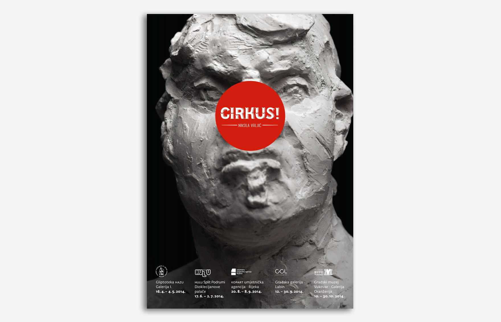 Cirkus! je kiparska izložba Nikole Vrljića, a dizajn za izložbe nekih od vizualnih umjetnosti uvijek je škakljivo raditi. Radovi sa izložbe uvijek se nameću kao logičan izbor za glavni vizual, a umijeće je onda integrirati informacije o izložbi u dizajn.