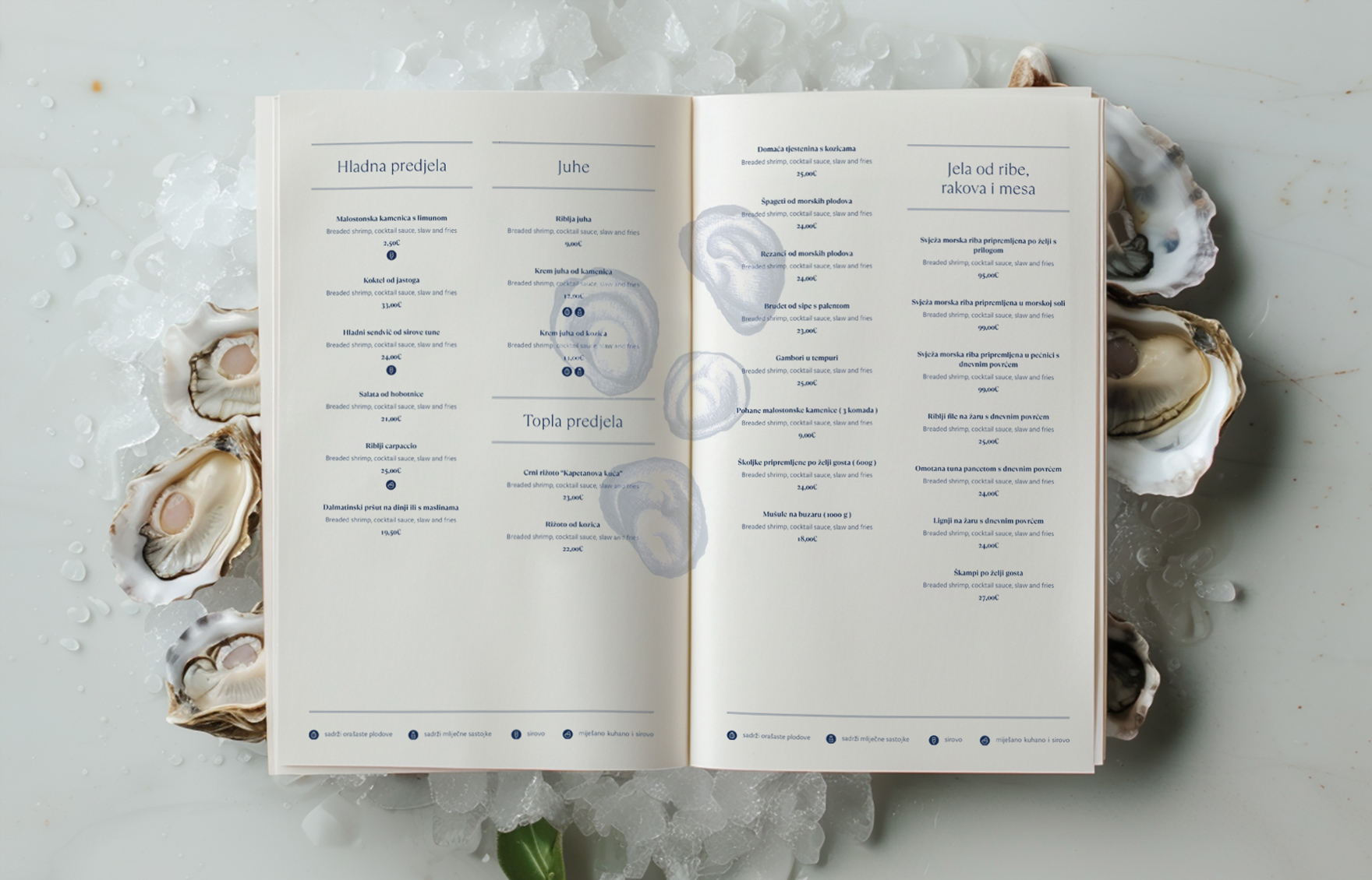 Znak je nastao iz inicjala restorana, slova ‘K’, koje je dizajnirano da podsjeća na profil brkatog kapetana. Kao prateći elementi napravljene su ilustracije morskih plodova.