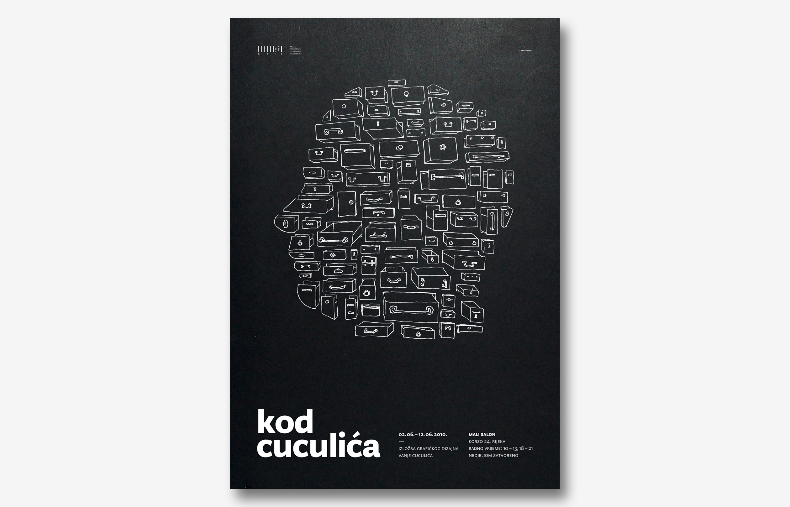 Glavni motiv je dizajnerov profil građen od ilustracija poluotvorenih ladica.